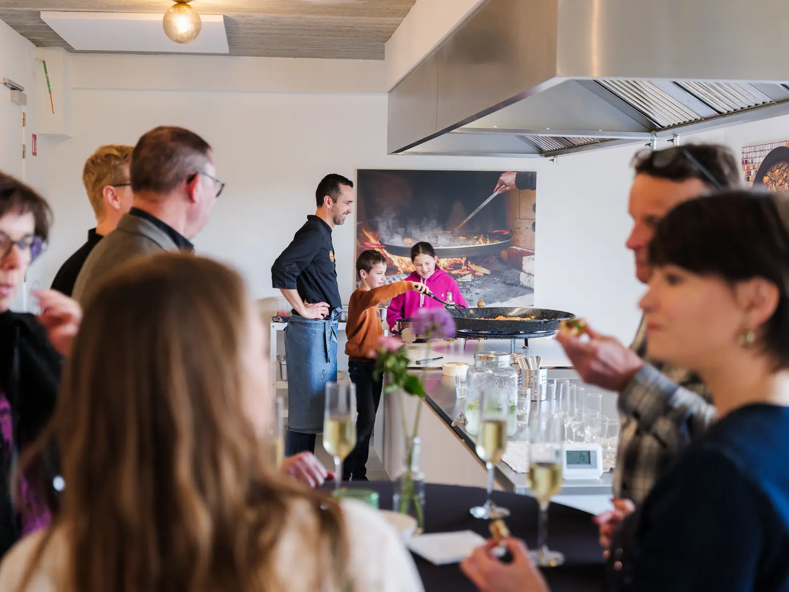 Terwijl de gasten genieten van aperitief en hapjes maken wij aan het kookeiland in de workshopruimte een grote pan paella klaar. Liefhebbers volgen de bereiding rond de pan, anderen snuiven de sfeer op aan een sta-tafeltje.