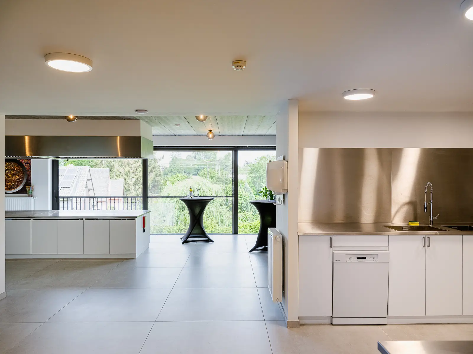 De gelijkvloerse verdieping omvat een grote workshop- en receptieruimte, een volledig uitgeruste professionele keuken, een vestiaire en 2 toiletten. Op de benedenverdieping is er een vergaderruimte / eetzaal (met beamer) die uitgeeft op het terras en de tuin.